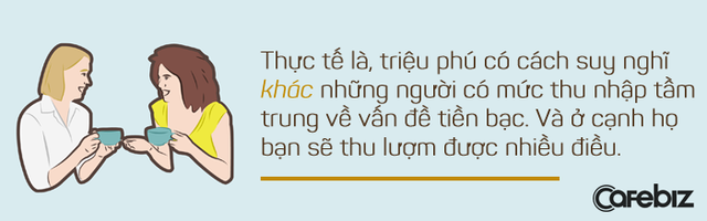 "Trong hầu hết mọi trường hợp, mức thu nhập của bạn cũng nằm trong nhóm mức thu nhập của những người bạn thân thiết của bạn", Siebold nói. "Tiếp xúc với những người thành công hơn bạn có thể mở rộng suy nghĩ và thúc đẩy thu nhập của bạn. Thực tế là, triệu phú có cách suy nghĩ khác những người có mức thu nhập tầm trung về vấn đề tiền bạc. Và ở cạnh họ bạn sẽ thu lượm được nhiều điều".