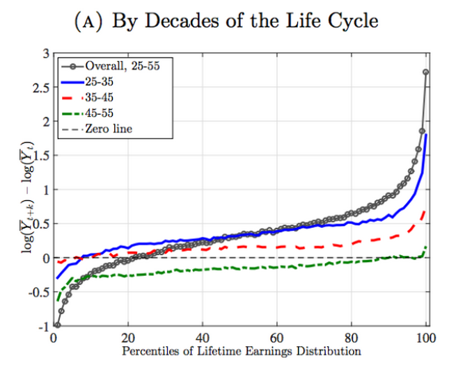 Kết quả là các nhà kinh tế học đã phát hiện, đối với cả người giàu và người nghèo, phần lớn tăng trưởng thu nhập diễn ra trong 10 năm đầu của sự nghiệp, đặc biệt là ở độ tuổi từ 25 đến 35. Trong suốt thập kỷ tiếp theo của sự nghiệp, đàn ông vẫn có thể kỳ vọng được tăng lương, nhưng mức tăng sẽ chậm chạp hơn rất nhiều.