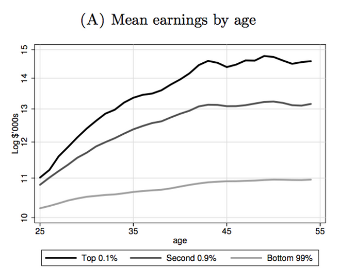 Trong khi đó, đối với giới siêu giàu (chỉ chiếm 0,1%) hoặc người giàu (1%) và phần đông dân số còn lại (99%), thu nhập về cơ bản ổn định sau tuổi 40.