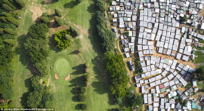 Bức ảnh này được chụp ở thành phố Durban, Nam Phi. Bên trái là hình ảnh Sân golf Papwa Sewgolum, bên phải là khu nhà của người dân lao động nghèo. Cả hai thế giới ngăn cách nhau bằng một hàng rào bê tông thấp.