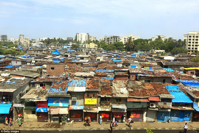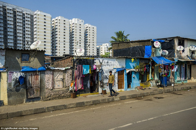 Những ngôi nhà lụp xụp của tầng lớp lao động nghèo nằm liền kề với những căn hộ chung cư cao cấp tại thành phố Mumbai, Ấn Độ.