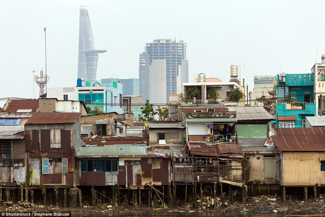Những ngôi nhà hiện đại, cao cấp với kiểu dáng đẹp nằm ngay phía sau những khu nhà ổ chuột thô sơ tạm bợ bên bờ sông Sài Gòn, thành phố Hồ Chí Minh, Việt Nam.