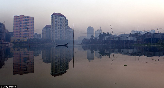 Đây là hình ảnh hai bên bờ hồ Gulshan ở Dhaka, Bangladesh. Một bên là những tòa nhà cao tầng sang trọng, còn một bên là những căn nhà sàn liêu xiêu.