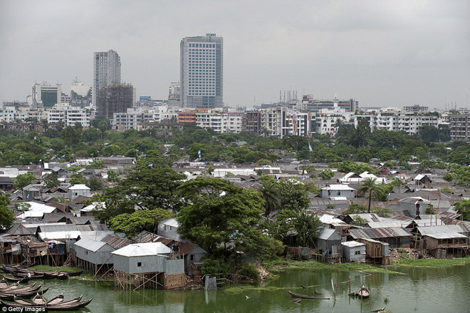 Sự chênh lệch giàu nghèo sẽ càng rõ nét hơn với hình ảnh được chụp từ trên không. Trong khi những khu ổ chuột nằm xung quanh, ôm lấy hồ Dhaka, thì những khu nhà cao tầng lại mọc lên ở phía xa, gần như "nhấn chìm" khu ổ chuột bên cạnh nó.