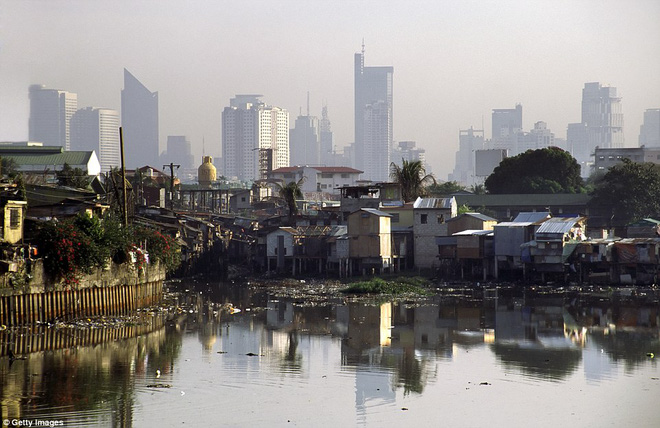 Hình ảnh đối lập giữa những tòa nhà chọc trời với những túp lều ở ven sông ở quận Makati, Manila, Phillipine.