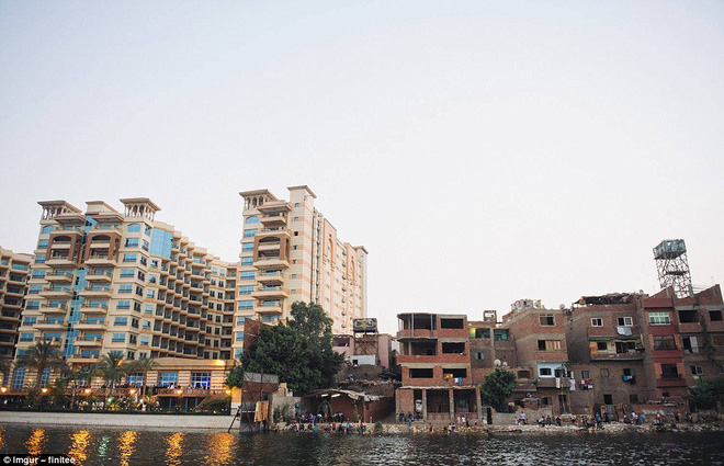 Những khu nhà bằng gạch thô sơ của dân lao động nghèo (phải) nằm tách biệt một bên với khu khách sạn phức hợp cao cấp (trái) ở thành phố Cairo, Ai Cập.