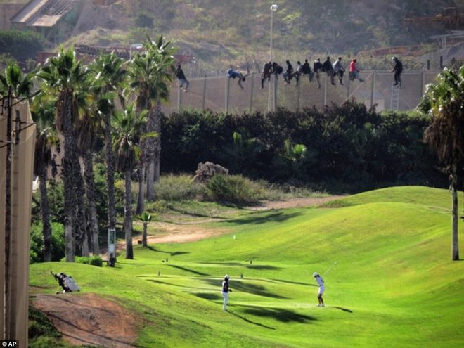 Bức ảnh này được chụp vào tháng 10/2014. Trong đó là hình ảnh một số người đang chơi golf tại khu vực Melilla, Tây Ban Nha, phía sau họ là hình ảnh vài người dân nhập cư đang nỗ lực vượt qua bức tường ngăn cách từ phía Morocco.